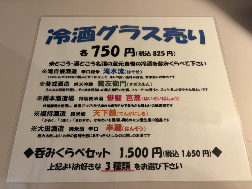 このあたりは日本酒が有名なようで、メニューが置いてありました。