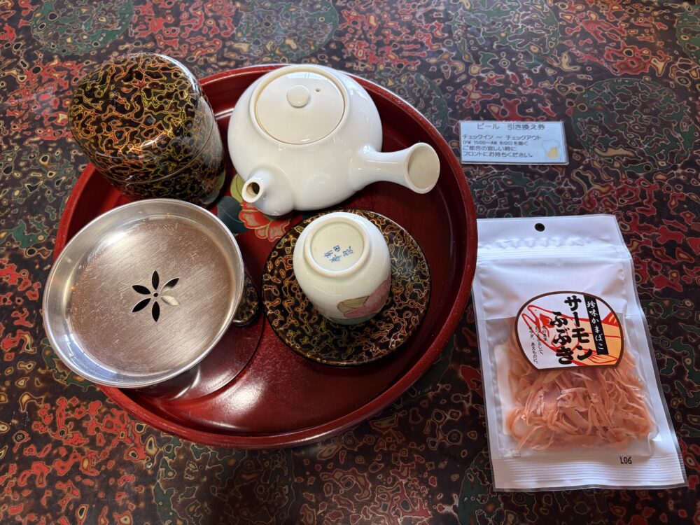 お茶セットとか。ビール付きのプランがあったので、つまみのおまけ付き。(このプラン、オススメです!)