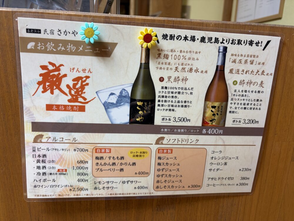 ドリンクのメニュー。大瓶が700円なので、温泉宿の最安レベル。