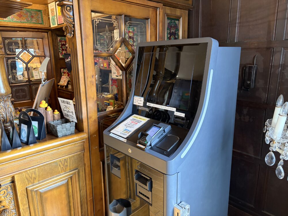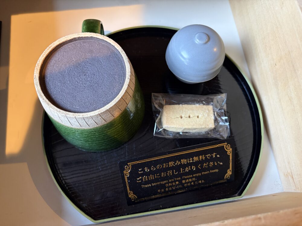 コーヒーマシンなどもあり、タブレットで貸切温泉の空き状況がチェックできるようになってました。
