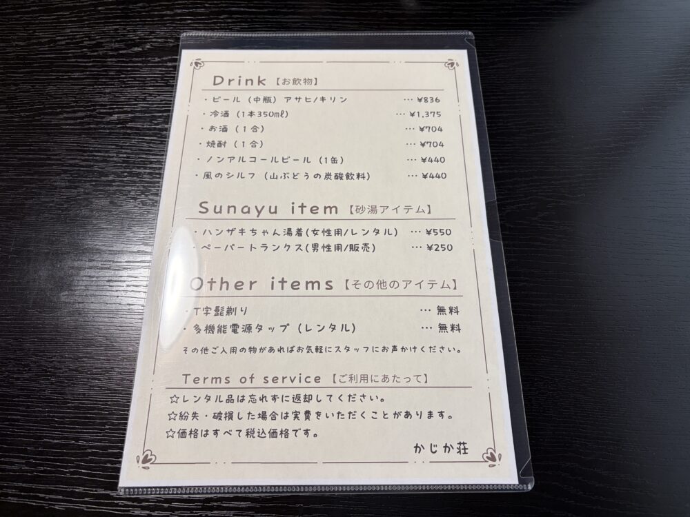 ドリンクのメニューはこのとおりお部屋に。