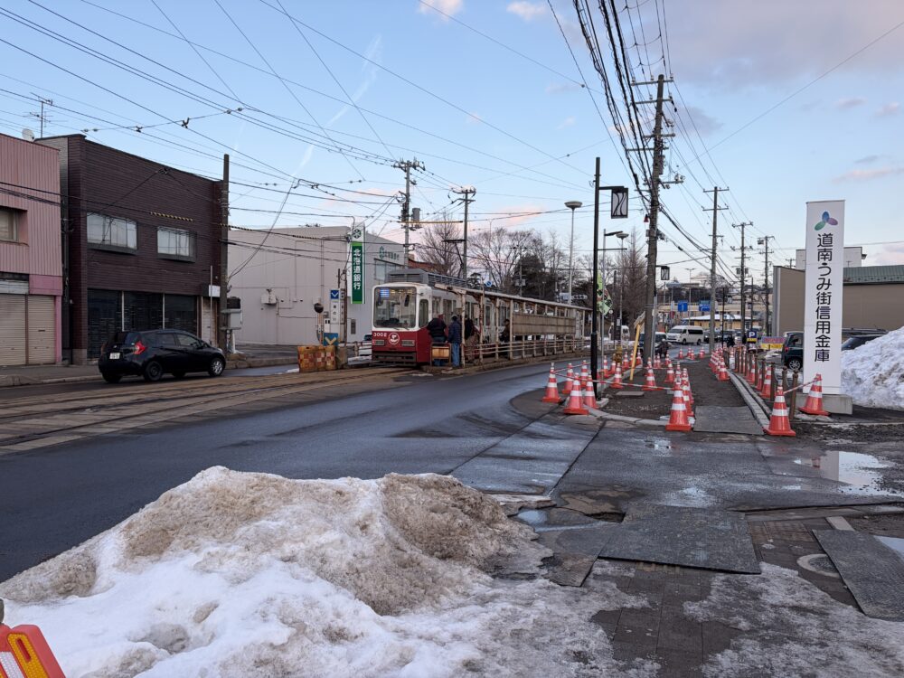 函館駅〜路面電車の「湯の川温泉」駅から降りてすぐ近く。歩いて5分はかからないくらい。