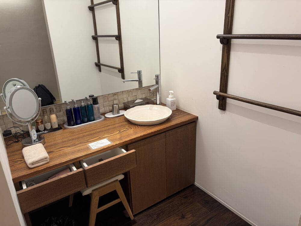 洗面所。ここにあった歯ブラシやブラシが最高で、最近、家でも使ってる…。